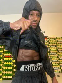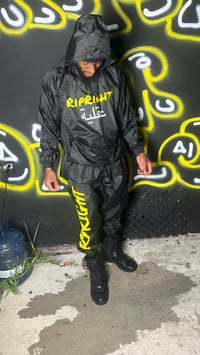 RipRight Mindset sauna suit, black & yellow with the Word mindset written on front chest in Arabic. Zipper pockets on both sides of the top equipped with a hoodie and draw strings.